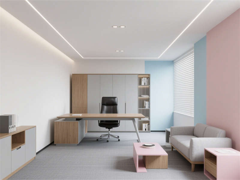 開放辦公區注重通透感與實用性,合理的工位布局兼顧隱私與交流,原木紋桌面增添溫馨感,點綴的莫蘭迪色系線條讓空間更顯靈動。經理辦公室融合辦公與接待功能,皮質辦公椅與木質家具提升質感,靠窗的休閑角落為辦公之余提供放松空間。?