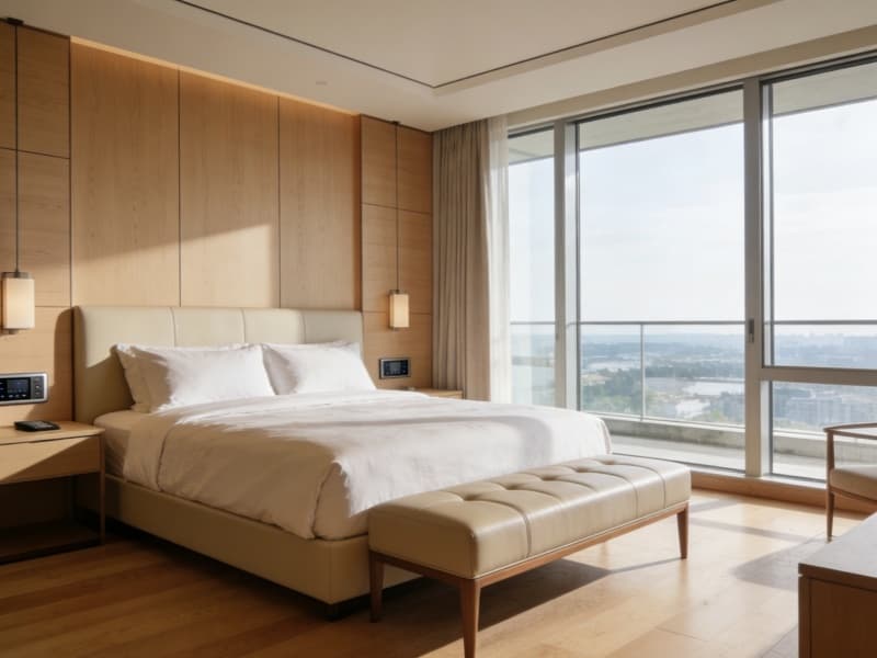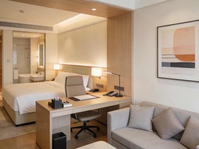 二至四層為住宿層,規(guī)劃約80間客房,包括豪華房、行政房等房型。客房以淺木色為主調(diào),搭配真皮軟裝與柔和燈光,營(yíng)造溫馨氛圍。每間客房均配備智能客控系統(tǒng),方便客人操作。