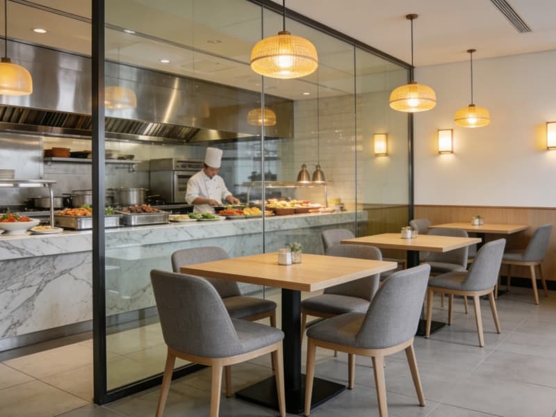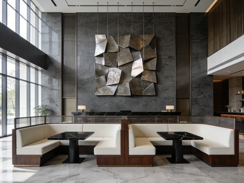 酒店一層為公共區(qū)域,大堂地面鋪淺灰色大理石,前臺(tái)背景墻以巖板結(jié)合藝術(shù)裝置,彰顯格調(diào)。大堂吧設(shè)半私密卡座,供客人休憩交流。全日制餐廳配備開(kāi)放式廚房,可讓客人直觀(guān)感受美食制作過(guò)程。