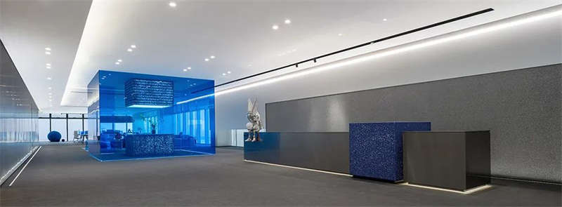 室內空間由功能家具和裝置形成自然分隔,空間整體因祛除隔斷而產生了流動,這與科學巨匠斯蒂芬·霍金的宇宙觀具有一種相通性。太空兔和隕石一起來到這里,被安置在接待臺和會議室中,向來訪的人們講述宇宙的故事,猶如那些激動人心的創業事跡一樣,源于有限的奇點,產生突破界限的無窮能量。