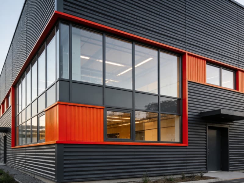 廠房外觀,大面積的金屬板材與玻璃組合,硬朗中透著通透感。色彩上以深灰色為主色調,搭配局部橙紅色的裝飾線條,增添視覺活力,同時也強化了建筑的識別性。